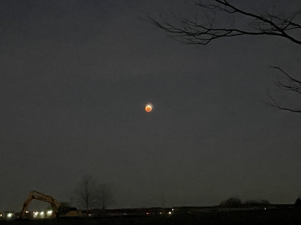 On my walk this morning. The moon is uncovering from the full eclipse. I took this photo with my iPhone 12. It’s as good as it gets. I should walk with my Canon, I guess, where I have more settings to play with.