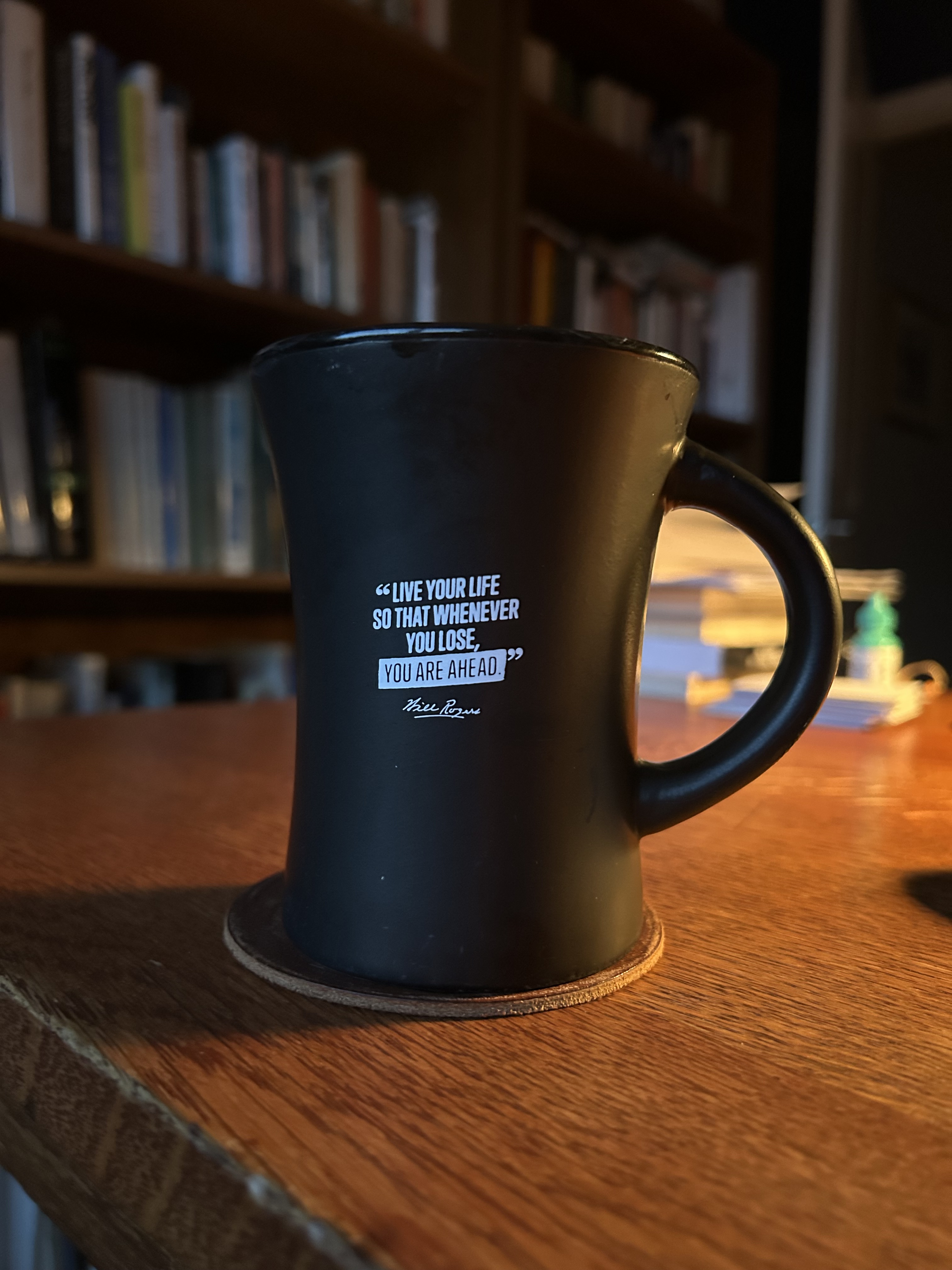 We purchased a coffee mug when we visited the Will Rogers estate a couple of years ago. It says, “Live your life so that whenever you los, you are ahead.”