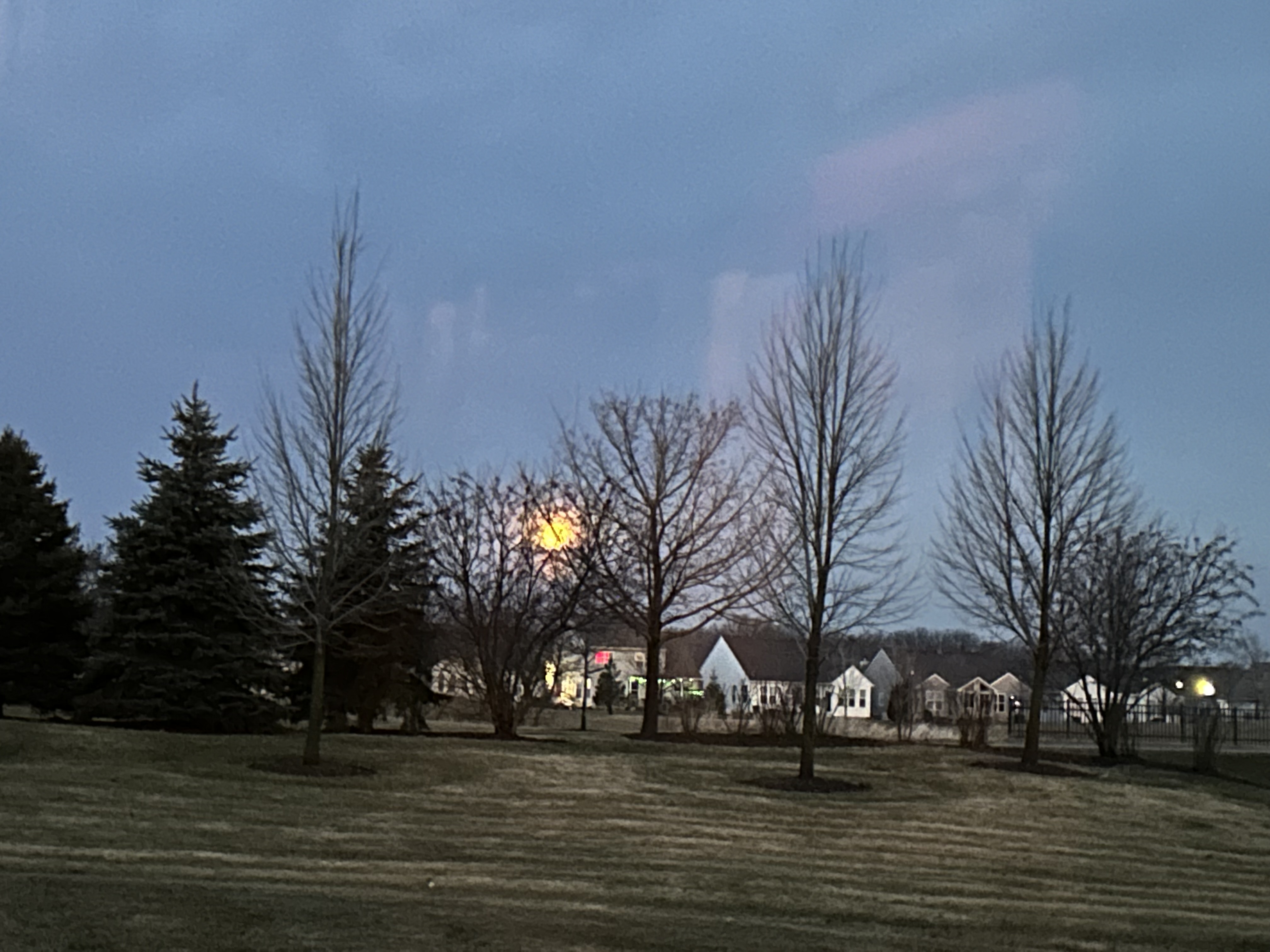 I sat at my desk at 6 am cup of coffee in hand turned looking from my window across the little par 3 golf course at the houses on the far side of our development. The sun will officially rise in half-an-hour. The moon is waxing gibbous, almost full, as it sets almost matching the sun rising.